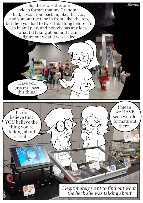 No, seriously, does ANYBODY have any idea what format this was? The closest I can come up with is Cartrivision, though the Quasar Great Time Machine sounds like a possibility as well (even if it’s more of a lever than[…]↓ Read the rest of this entry…