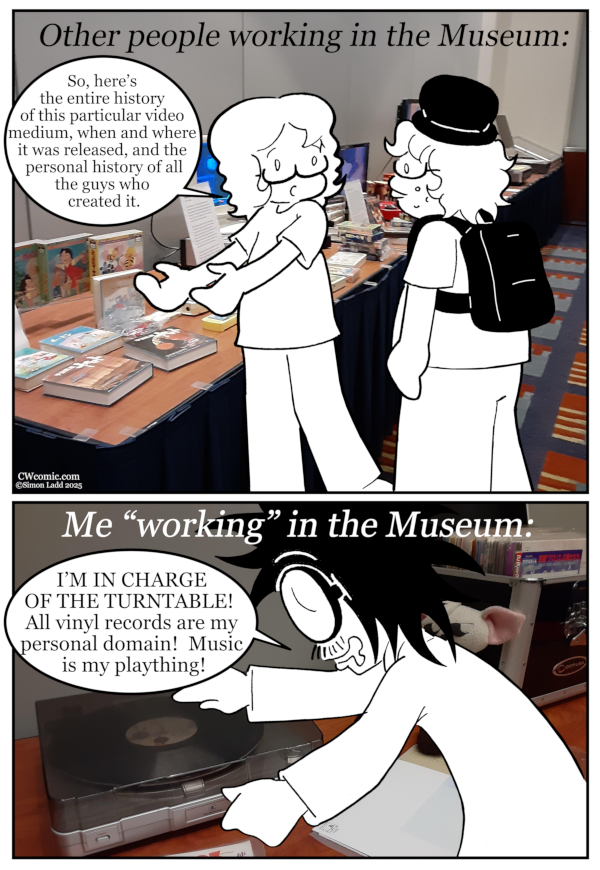 Yeah, on top of all the video format exhibits we had on display in the Museum room, we ALSO had a turntable set up to spin everybody’s various anime soundtracks and random Japanese vinyl. Just because. Hey, if some convention[…]↓ Read the rest of this entry…
