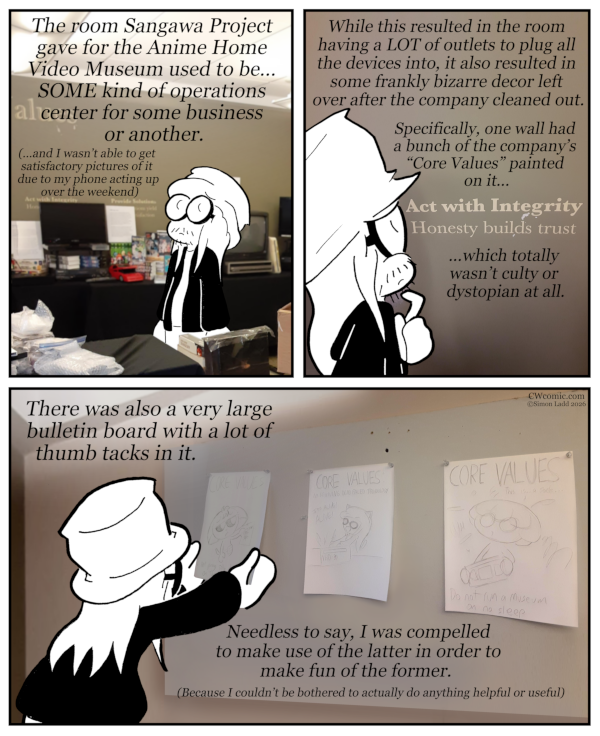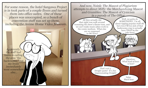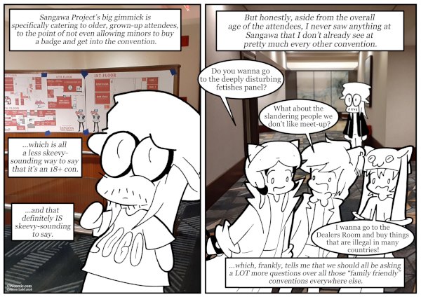 I’m rather annoyed at the moment. I’d intended to accompany this comic with a bit of a supplementary rant about conventions profiting off of drawing in a younger crowd without doing enough to actually clean up the environment being provided[…]↓ Read the rest of this entry…